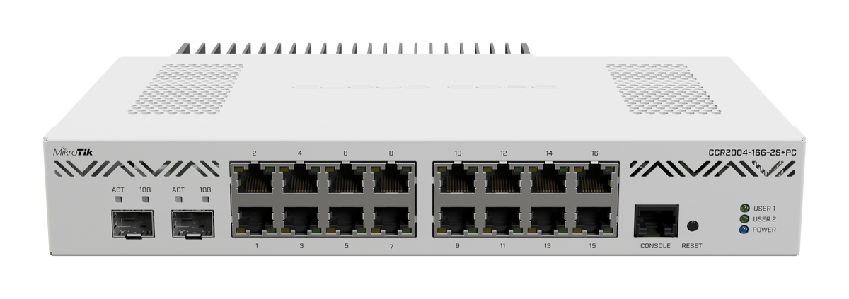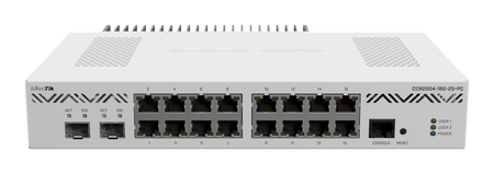 Mikrotik Cloud Core Router 2004-16G-2S+ with Annapurna Labs Alpine v2 CPU (4xARMv8-A Cortex-A57), 4GB RAM, 128MB NAND storage, 16x GLAN, 2x SFP+ ports, Passive Cooling desktop enclosure, PSU, RouterOS L6