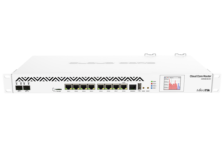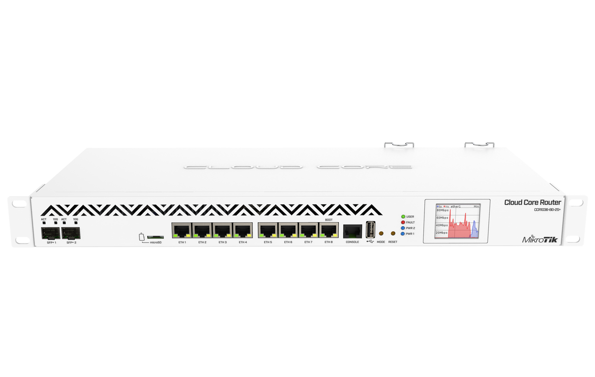 Mikrotik Cloud Core Router 1036-8G-2S+ with Tilera Tile-Gx36 CPU (36-cores, 1.2GHz per core), 4GB RAM, 2x SFP+ cage, 8x Gigabit LAN, RouterOS L6, 1U rackmount case, PSU, LCD panel