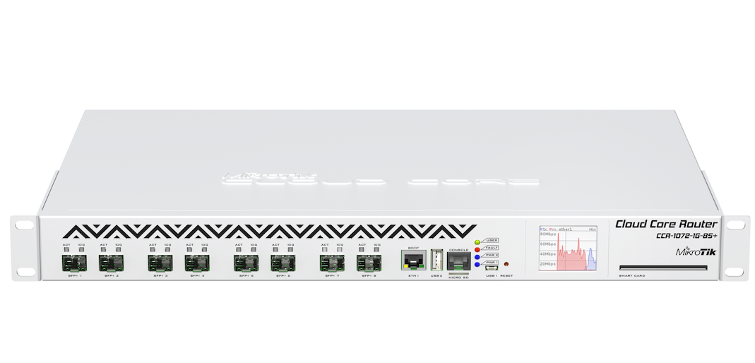Mikrotik Cloud Core Router 1072-1G-8S+ with Tilera Tile-Gx72 CPU (72-cores, 1.2GHz per core), 16GB RAM, 8x SFP+ cage, 1x Gigabit LAN, RouterOS L6, 1U rackmount case, 2x Redundant PSUs, LCD panel.