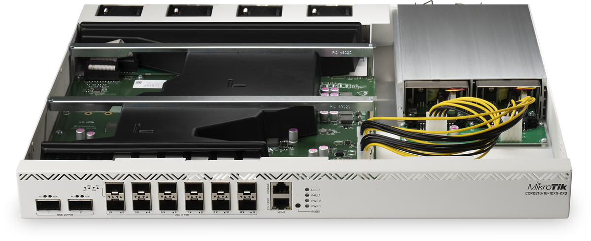 Mikrotik Cloud Core Router 2216-1G-12XS-2XQ with Amazon Annapurna Labs Alpine v3 AL73400 CPU and Marvell Prestera Aldrin2 Switch-chip, 16GB RAM, 2x 100G QSFP, 14x 25G SFP28, 1x GLAN, RouterOS L6, 1U, Dual PSUs