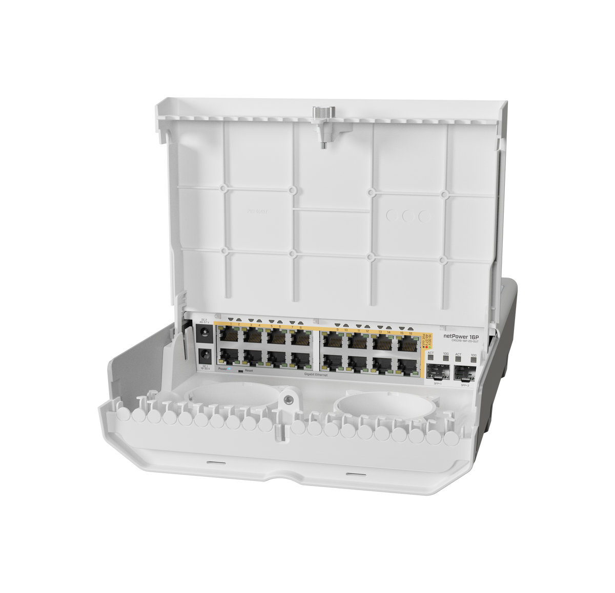 Mikrotik Cloud Router Switch 318-16P-2S+OUT with 800MHz CPU, 256MB RAM, 16x GLAN w/PoE-Out, 2x SFP+ cages, RouterOS L5 or SwitchOS (dual boot), outdoor enclosure, mounting kit. Power supply Not included. Sale price while supplies last